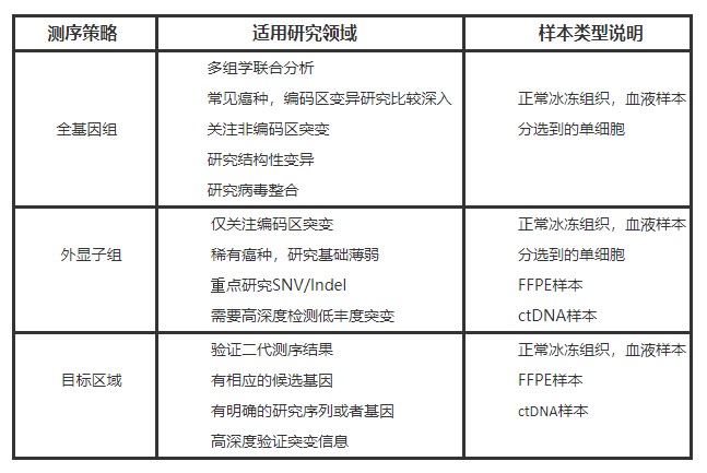 NGS用于疾病研究,最常用的测序策略有3种:全基因组测序、全外显子测序、目标区域测序,3种测序方案的适用范围有所不同,如下表: