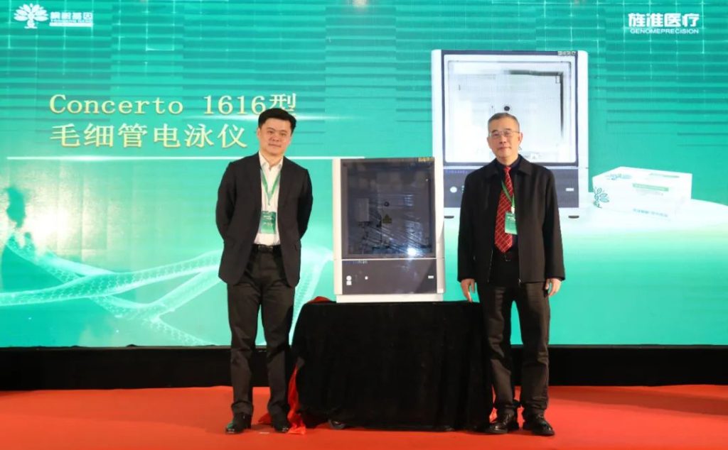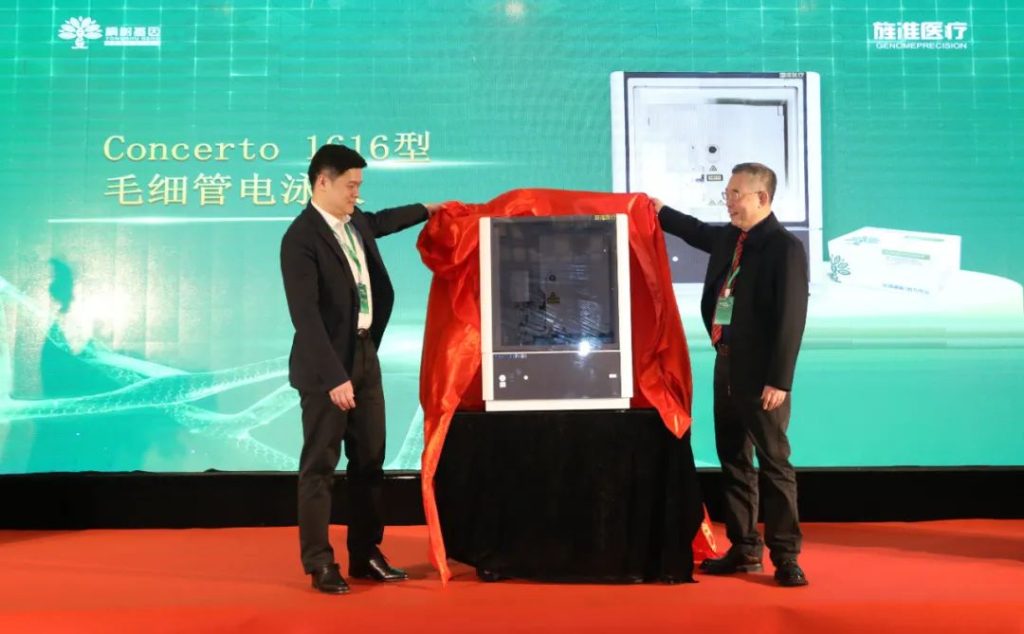 在众人的期待下,开启本次合作产品的揭幕仪式。由桐树基因CEO严令华先生和旌准医疗董事长兼总经理叶锋先生揭晓本次战略合作的主打产品,分别是由桐树基因研发的采用双重金标准的MSI 2B3D检测试剂盒,以及由旌准医疗推出的Concerto 1616全自动毛细管电泳仪。